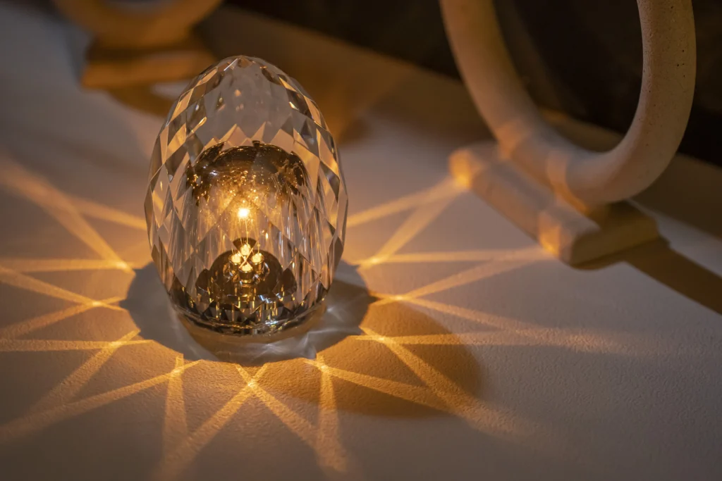 爍爍光芒透過精雕細琢的水晶傾瀉而下,從各個角度投射出迷人的陰影和反射。 藉由其無線充電底座的功能,您可以輕鬆地將其放置在任何地方,並立即在您的空間中營造出迷人的氛圍。 這款迷人的作品完美融合了藝術性和功能性,為您的周圍環境提供完美氛圍。